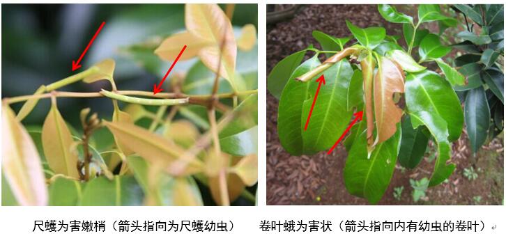 荔枝尺蠖和卷葉蛾均屬鱗翅目的蛾類,成蟲(chóng)通常在5cm左右長(zhǎng)荔枝嫩梢葉片上產(chǎn)卵,卵孵化后幼蟲(chóng)咬食嫩梢嫩葉,隨著幼蟲(chóng)齡期的增長(zhǎng),其食量逐漸加大,嚴(yán)重時(shí)整株枝嫩葉被食光。因此,在新梢長(zhǎng)5cm左右和第1—2復(fù)葉張開(kāi)前,是噴藥防治的最佳時(shí)期。