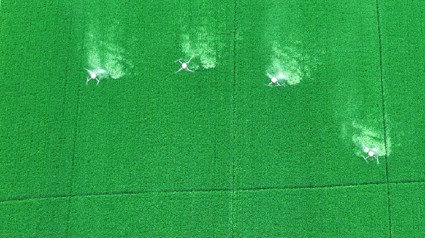 東風(fēng)湖農(nóng)場采取植保無人機(jī)編隊協(xié)同作業(yè)的方式,精準(zhǔn)高效噴施混合藥劑,全面推進(jìn)“一噴三防”工作。(高 原)