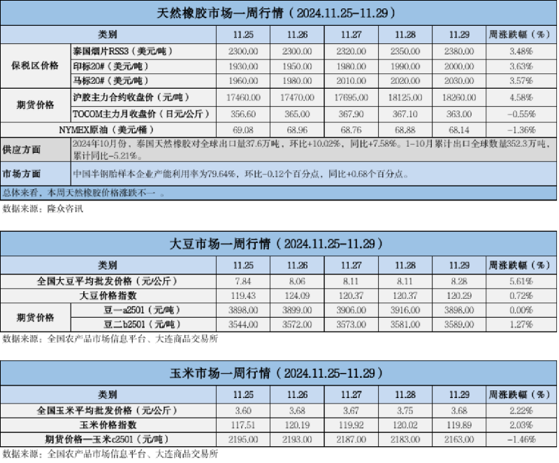 天然橡膠、大豆、玉米市場(chǎng)一周行情(2024.11.25-11.29)
