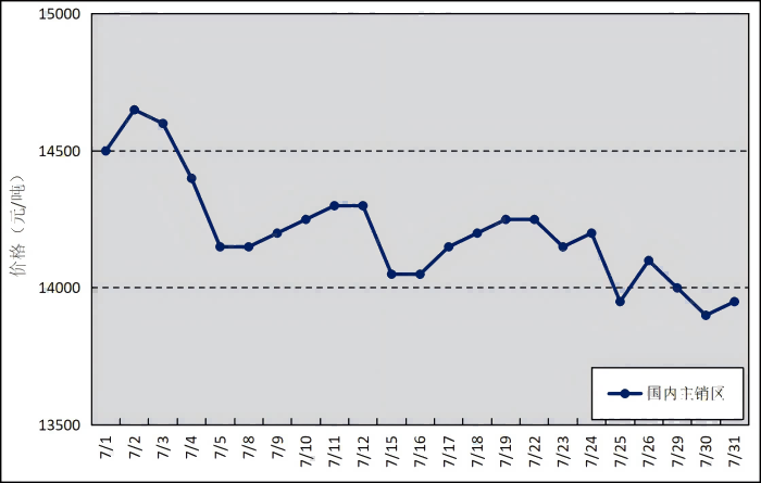 國內(nèi)主銷區(qū):7月,上海、青島和天津等銷區(qū)市場的國產(chǎn)全乳標準膠平均價格為14204元/噸,環(huán)比下跌441元/噸,最高價為14650元/噸,最低價為13900元/噸。