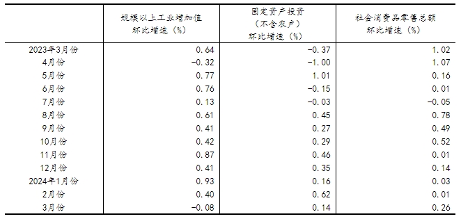(2)根據(jù)季節(jié)調(diào)整模型自動(dòng)修正結(jié)果,對(duì)近一年來各期國(guó)內(nèi)生產(chǎn)總值、規(guī)模以上工業(yè)增加值、固定資產(chǎn)投資(不含農(nóng)戶)、社會(huì)消費(fèi)品零售總額環(huán)比增速進(jìn)行修訂。修訂結(jié)果及2024年一季度GDP環(huán)比數(shù)據(jù)、2024年3月份其他指標(biāo)環(huán)比數(shù)據(jù)如下: