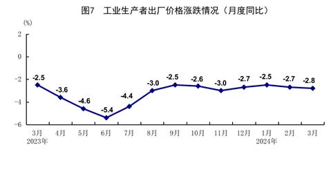 一季度,全國(guó)工業(yè)生產(chǎn)者出廠價(jià)格同比下降2.7%。其中,3月份同比下降2.8%,環(huán)比下降0.1%。一季度,工業(yè)生產(chǎn)者購(gòu)進(jìn)價(jià)格同比下降3.4%。其中,3月份同比下降3.5%,環(huán)比下降0.1%。