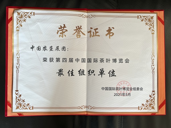 3.2021年5月,經(jīng)濟(jì)貿(mào)易處牽頭組織,精選12個墾區(qū)的29家茶企,以“中國農(nóng)墾展團(tuán)”的形式,參加第四屆中國國際茶業(yè)博覽會,會上開展了中國農(nóng)墾茶品牌推介活動、發(fā)布中國農(nóng)墾茶產(chǎn)業(yè)聯(lián)盟形象宣傳片,對促進(jìn)農(nóng)墾茶產(chǎn)業(yè)發(fā)展、提高農(nóng)墾茶品牌影響力奠定了堅實的基礎(chǔ)。中國農(nóng)墾展團(tuán)獲得第四屆中國國際茶業(yè)博覽會最佳組織單位。
