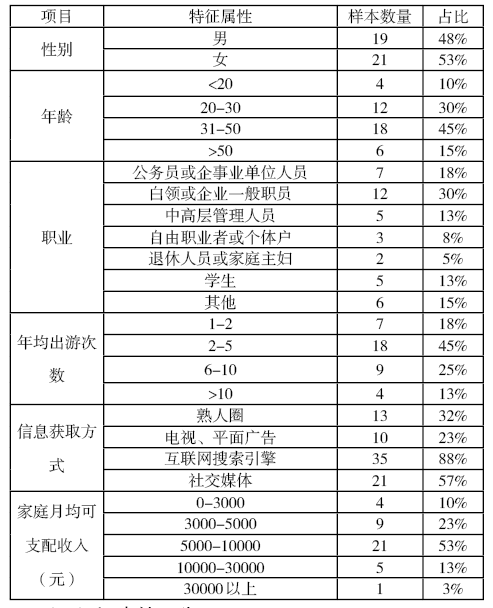 通過深度訪談形成基本的測試樣本,受訪者中,企事業(yè)單位職工和白領(lǐng)占48%;年均出游次數(shù)以2-5次居多,占45%;習(xí)慣利用互聯(lián)網(wǎng)搜索、社交媒體獲取信息。基本屬性見下表。
