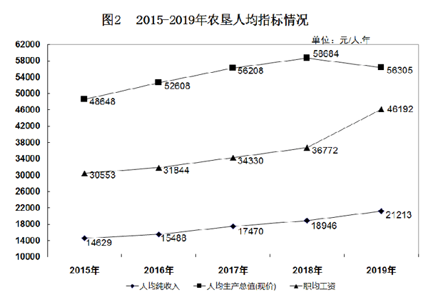 全年農墾經濟實現生產總值17886.25億元(見圖1)。其中,第一產業(yè)增加值1828.37億元;第二產業(yè)增加值3290.01億元;第三產業(yè)增加值2767.87億元。第一、第二、第三產業(yè)增加值占農墾生產總值的比重分別為23.2%、41.7%和35.1%。人均生產總值56305元;人均可支配收入持續(xù)增長,達到21213元,比上年增長12%(見圖2)。
