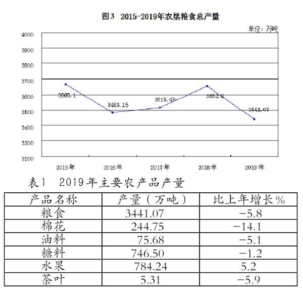 糧食總產量23441.07萬噸,比上年減少211.73萬噸,下降5.8%(見圖3)。主要農產品產量見表1。