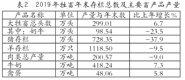 畜牧業(yè)占農業(yè)總產值比重23.0%,比上年增長2.6個百分點。牲畜年末存欄總數及主要畜產品產量見表2。