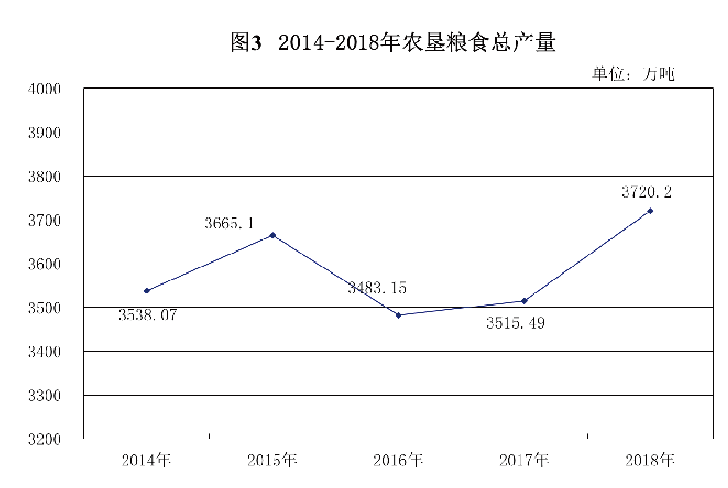 糧食總產(chǎn)量達(dá)到3720.20萬噸,比上年增加204.71萬噸,增長5.8%(見圖3)。