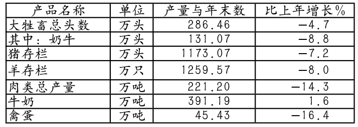 畜牧業(yè)占農(nóng)業(yè)總產(chǎn)值比重為20.4%,比去年下降1.8個(gè)百分點(diǎn);牲畜年末存欄總數(shù)及主要畜產(chǎn)品產(chǎn)量(見表2)。