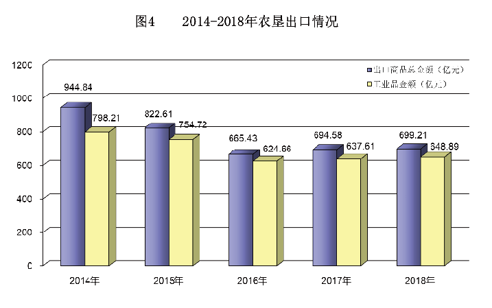 全年出口供貨商品總金額699.21億元(見圖4),比上年增加4.63億元,增長0.7%。出口商品供貨總額超過10億元的墾區(qū)分別是:新疆兵團(tuán)473.07億元、廣東77.65億元、湖北40.96億元、江西37.07億元、河北24.27億元、廣西10.04億元,上述6個(gè)墾區(qū)出口金額合計(jì)達(dá)663.06億元,占全國農(nóng)墾出口商品總金額的94.8%。