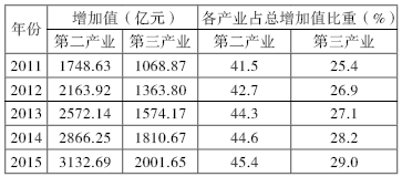《中國農(nóng)墾統(tǒng)計(jì)年鑒》顯示,從2011年至2015年,農(nóng)墾系統(tǒng)二三產(chǎn)業(yè)增加值持續(xù)上升,2014年起第三產(chǎn)業(yè)的增加值占比超越了第一產(chǎn)業(yè)。詳見表1。
