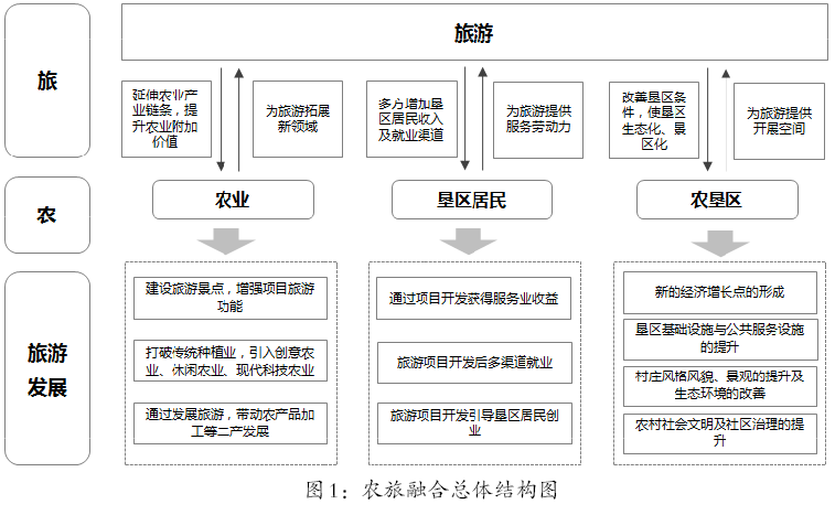 農(nóng)旅融合是農(nóng)業(yè)、墾區(qū)居民、農(nóng)墾區(qū)三者分別與旅游進(jìn)行深度結(jié)合,是一種新型的鄉(xiāng)村產(chǎn)業(yè)形態(tài)和消費(fèi)形態(tài)。在充分發(fā)揮農(nóng)業(yè)生產(chǎn)功能的前提下,合理開發(fā)墾區(qū)生態(tài)資源、土地資源、勞動力資源等生產(chǎn)要素,開發(fā)休閑農(nóng)業(yè)、鄉(xiāng)村旅游、農(nóng)旅地產(chǎn)、康體療養(yǎng)等核心配套項(xiàng)目,使農(nóng)墾資源與旅游產(chǎn)業(yè)互相促進(jìn),相輔相成,共同加快農(nóng)墾供給側(cè)結(jié)構(gòu)性改革,繁榮墾區(qū)經(jīng)濟(jì)。詳見圖1。