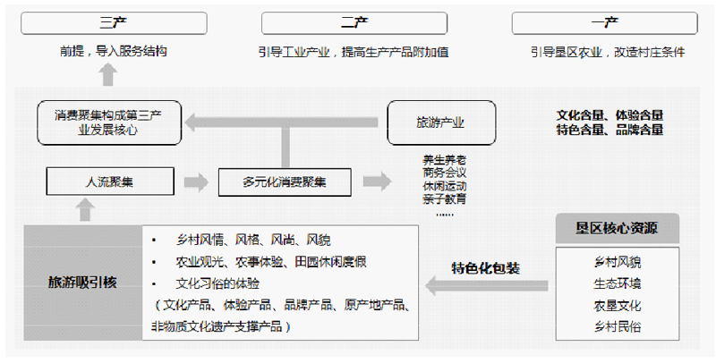 農(nóng)墾系統(tǒng)的“321”全產(chǎn)業(yè)鏈發(fā)展模式,強(qiáng)調(diào)三產(chǎn)之間的互動效率和產(chǎn)業(yè)能力提升。這一模式以墾區(qū)核心資源的分析挖掘?yàn)槠瘘c(diǎn),通過對資源的特色化、產(chǎn)品化包裝形成旅游產(chǎn)業(yè)的吸引核,以聚集人氣,形成旅游引導(dǎo)的消費(fèi)聚集,并引致消費(fèi)產(chǎn)業(yè)的就業(yè)供給側(cè)聚集,形成以旅游產(chǎn)業(yè)為核心的三產(chǎn)服務(wù)結(jié)構(gòu),進(jìn)而引導(dǎo)加工產(chǎn)業(yè)發(fā)展,帶動墾區(qū)農(nóng)業(yè)發(fā)展方式轉(zhuǎn)型升級。